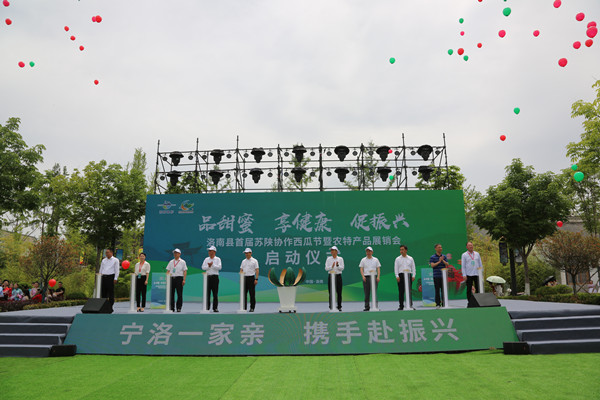 在歡快的音樂聲中,與會領(lǐng)導(dǎo)共同啟動(dòng)“洛南縣首屆蘇陜協(xié)作西瓜節(jié)暨農(nóng)特產(chǎn)品展銷活動(dòng)”,并興致勃勃地觀看了文藝演出。