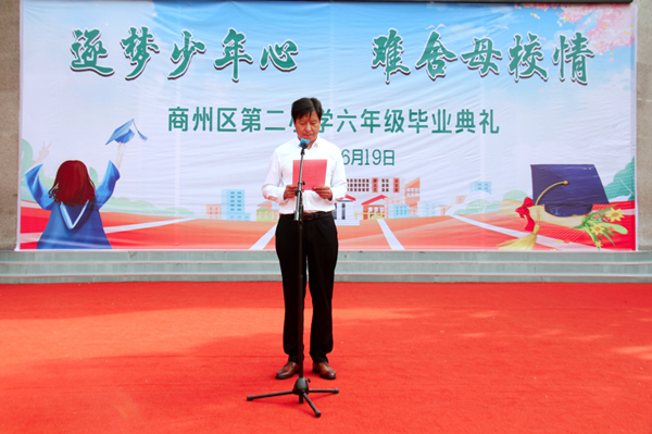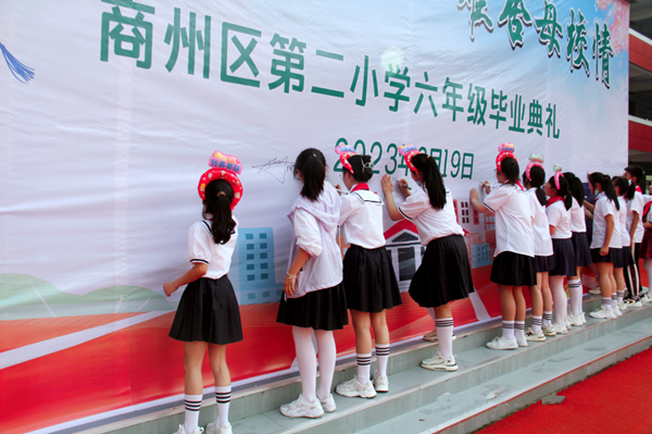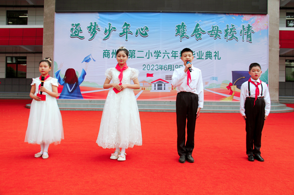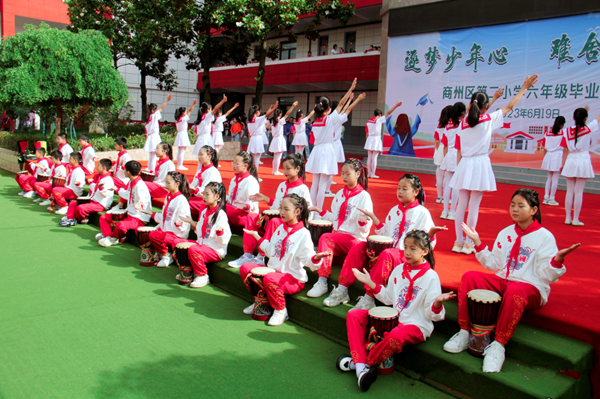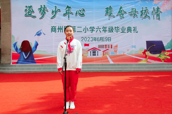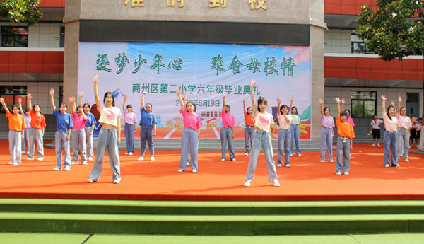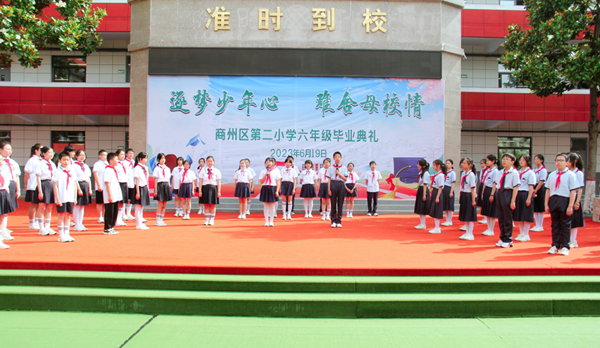 又是一年畢業(yè)季,依依惜別話情深。為了讓畢業(yè)生感受母校的關(guān)懷,銘記恩師的教誨,為小學(xué)生活畫上圓滿的句號(hào),同時(shí)激勵(lì)同學(xué)們立志未來,不負(fù)時(shí)代,以更加飽滿的精神和無比昂揚(yáng)的斗志步入新生活,開啟新征程,2023年6月19日上午,商州區(qū)第二小學(xué)舉行了以“逐夢少年心 難舍母校情”為主題的六年級(jí)畢業(yè)典禮活動(dòng)。學(xué)校班子成員、六年級(jí)全體老師及六百多名畢業(yè)生參加了此次活動(dòng)。畢業(yè)典禮在莊嚴(yán)肅穆的國歌聲中拉開帷幕。伴著雄壯的音樂,孩子們激昂的歌聲在校園里回蕩。緊接著,情景劇《不能說再見》精彩呈現(xiàn):深情的對(duì)白,歡快的音樂,動(dòng)感的鼓點(diǎn),輕盈的舞步,師生同臺(tái)演繹,盡顯青春活力。