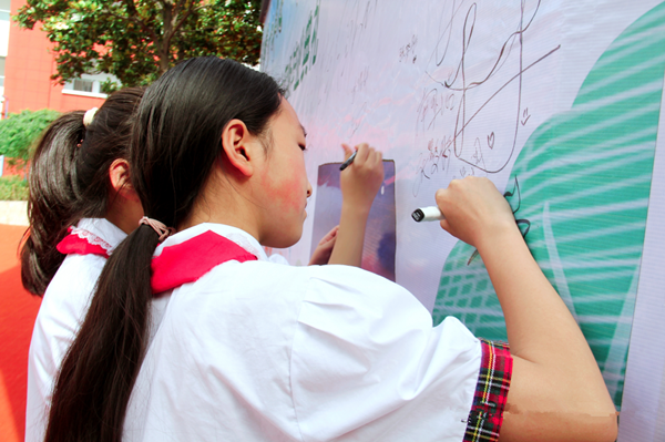 一朝沐杏雨,一生念師恩。離別之際,老師們?cè)谝皇住陡卸鞯男摹分凶呱衔枧_(tái),學(xué)生代表為老師們獻(xiàn)鮮花,表達(dá)他們對(duì)師長最崇高的敬意,表達(dá)對(duì)母校的感謝!隨后畢業(yè)生代表上臺(tái)簽名,同學(xué)們拿起簽字筆,將對(duì)母校的不舍以及對(duì)老師們的感謝化作一筆一劃,伴隨著自己的名字,寫進(jìn)畢業(yè)生簽名墻上。