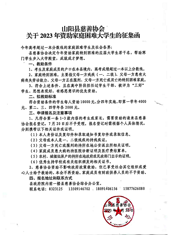 今年高考超過一本分?jǐn)?shù)線的家庭困難學(xué)生及社會各界:縣慈善協(xié)會決定今年資助家庭特別困難的應(yīng)屆大學(xué)生若干名,幫助寒門學(xué)生步入大學(xué)殿堂,成就成才夢想。