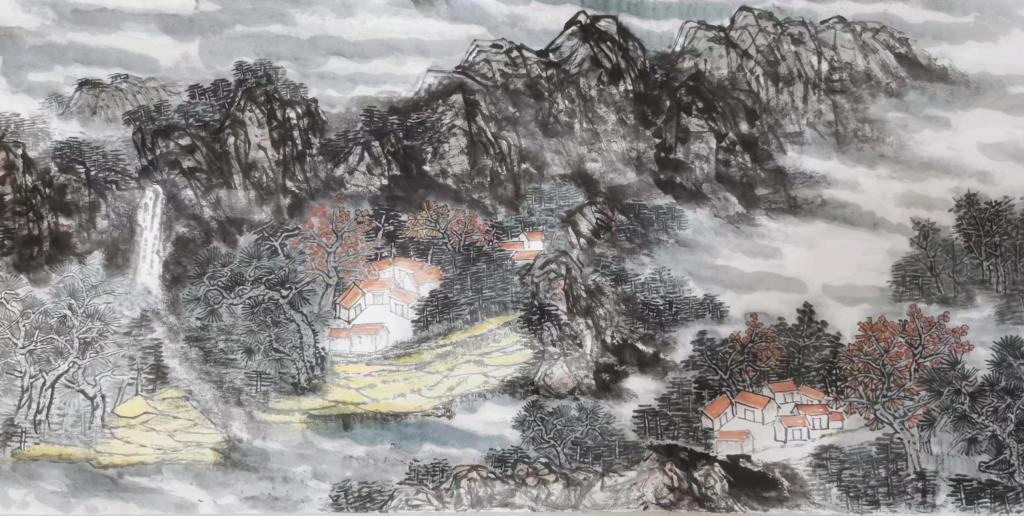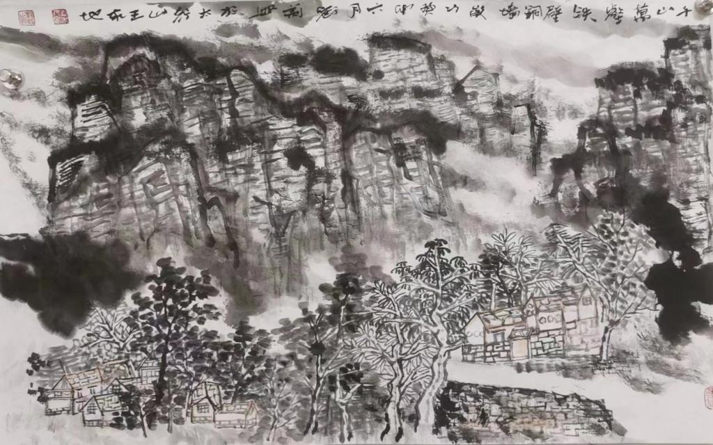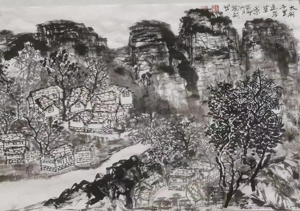 劉莉女士自幼酷愛書畫藝術(shù),幾十年來一直鐘情于山水畫的創(chuàng)作表現(xiàn),情結(jié)不改。扎根傳統(tǒng),面向生活,師發(fā)心源,用畫筆寫秦嶺之雄渾,寫丹水兩岸之蒼翠。謳歌青山不墨千年畫,綠水無弦萬古琴的壯美景色。她取歷代名家的筆法意趣為己所用,用提按頓挫的書法用筆寫山水。她的寫意山水立意高古,不著俗痕,線條生澀老辣,構(gòu)圖巧妙極富張力,疊起的山巒脈象,如老臂獨(dú)出引領(lǐng)兒孫。祥云霧繞中左鄰右村現(xiàn)諸筆端。畫中,房前綠樹成蔭,屋后高山流水,四面群山環(huán)繞,寫盡了氣息宜收宜斂的風(fēng)水訣,寄托著喜居寶地千年旺的樸素情懷。