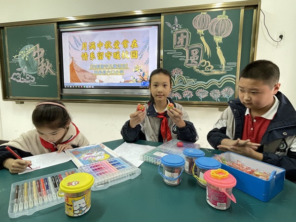 活動中,留守兒童通過看圖片、看視頻、講故事等方式,在輕松愉悅的互動中,重溫了中秋節(jié)的來歷,了解了中秋節(jié)的民風習俗,分享了與中秋節(jié)相關的詩詞典故。通過畫一畫、捏一捏的形式,組織孩子們開展巧手畫月餅、彩泥做月餅及巧思制燈籠等活動,進一步深化學生對中秋民俗的認識和理解,傳遞濃濃的中秋情意。一張張創(chuàng)意滿滿的美術作品、一個個形態(tài)各異的月餅、一盞盞美輪美奐的燈籠,不一會就在孩子們的小手下呈現(xiàn)出來。“哇,我的彩泥月餅真好看,今天晚上我拍個照片分享給媽媽!”學生李婉欣激動地忍不住蹦起來;“老師,明年的中秋節(jié)我們再一起做月餅吧!”學生劉代鑫意猶未盡......成功的喜悅洋溢在一張張興奮的小臉上?,F(xiàn)場氣氛歡樂祥和,其樂融融,留守兒童在動手實踐中體會著民俗文化的魅力,在歡聲笑語中感受到了學校大家庭的溫暖。