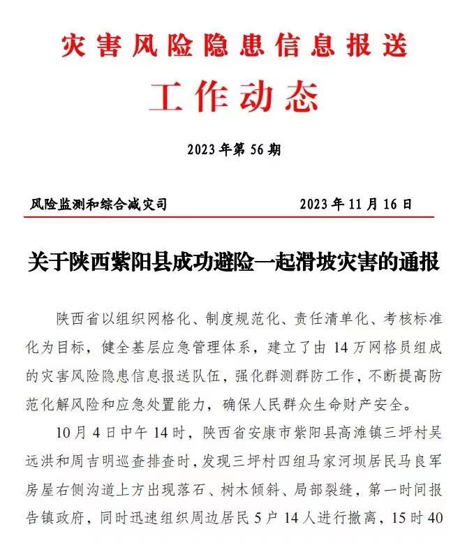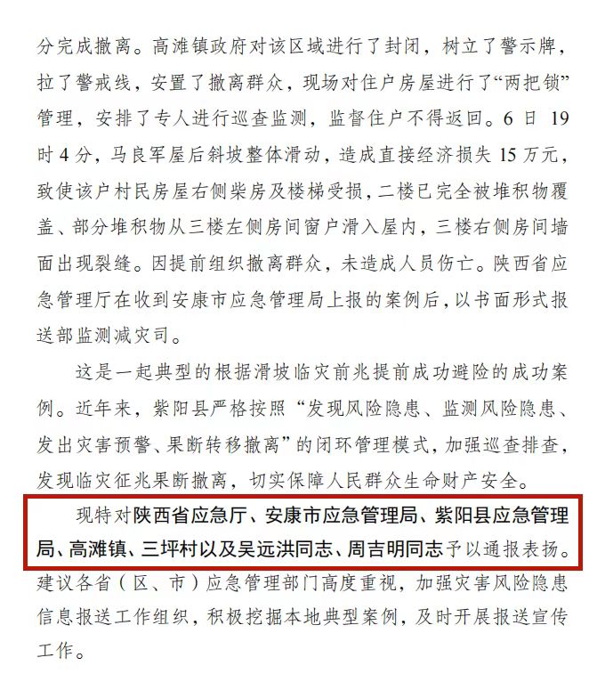 近日,應(yīng)急管理部風(fēng)險(xiǎn)監(jiān)測(cè)和綜合減災(zāi)司印發(fā)災(zāi)害風(fēng)險(xiǎn)隱患信息報(bào)送工作動(dòng)態(tài),通報(bào)表?yè)P(yáng)安康市紫陽(yáng)縣成功避險(xiǎn)一起滑坡災(zāi)害,并對(duì)安康市應(yīng)急管理局、紫陽(yáng)縣應(yīng)急管理局、高灘鎮(zhèn)、三坪村以及吳遠(yuǎn)洪同志、周吉明同志予以通報(bào)表?yè)P(yáng)。