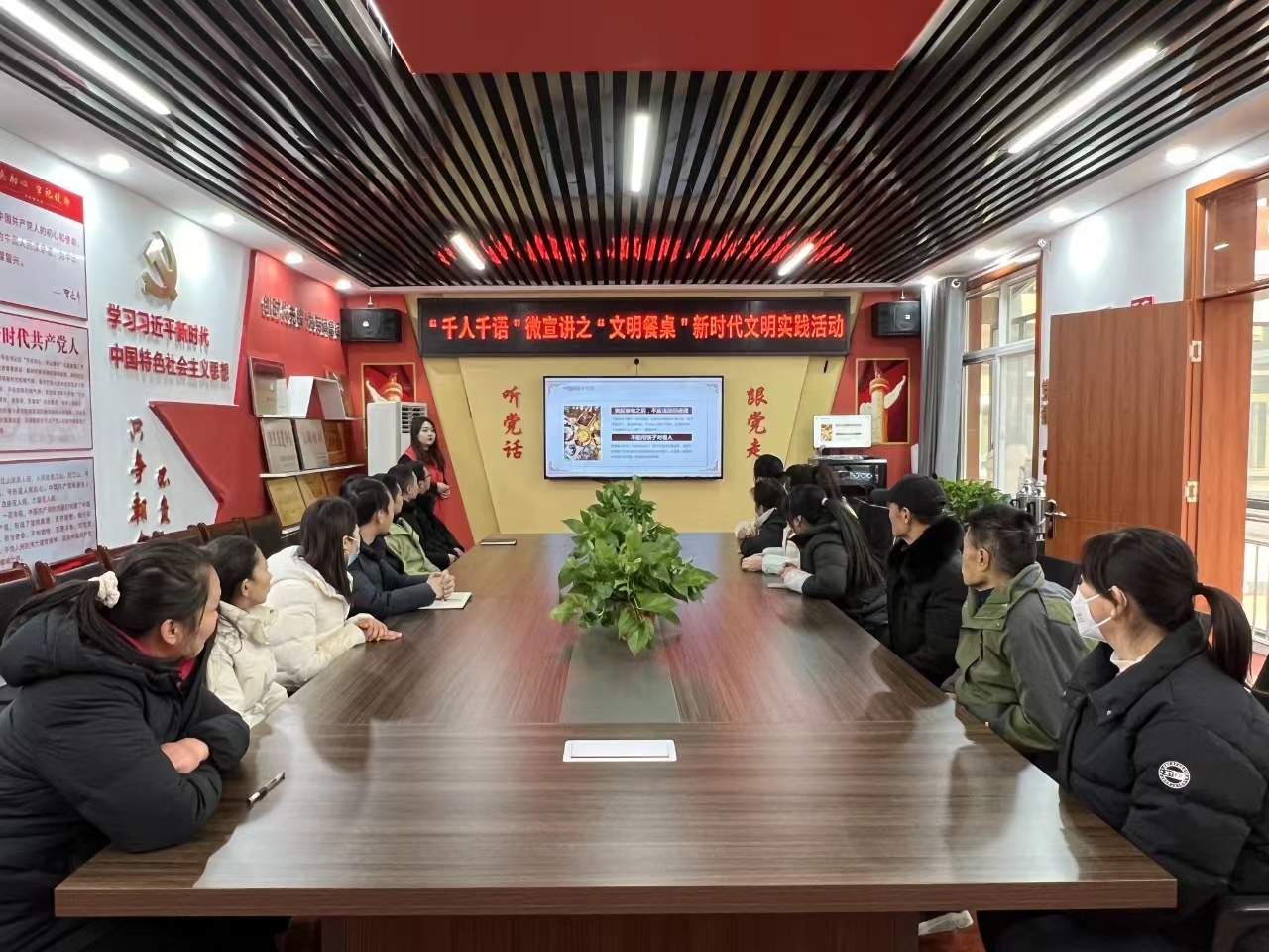 活動(dòng)中,社區(qū)志愿宣講員用生動(dòng)形象的PPT切入“文明餐桌”主題,以小切口呈現(xiàn)大主題,用群眾喜聞樂見的形式,不斷讓“文明餐桌”理念走進(jìn)群眾心里。隨后,帶領(lǐng)大家朗讀《文明用餐》倡議書,號(hào)召大家使用公筷公勺,適量點(diǎn)餐,不酗酒、不暴飲暴食,講究餐桌禮儀,在外就餐不大聲喧嘩,不聚眾鬧事,形成“文明用餐、理性消費(fèi)”的好習(xí)慣。