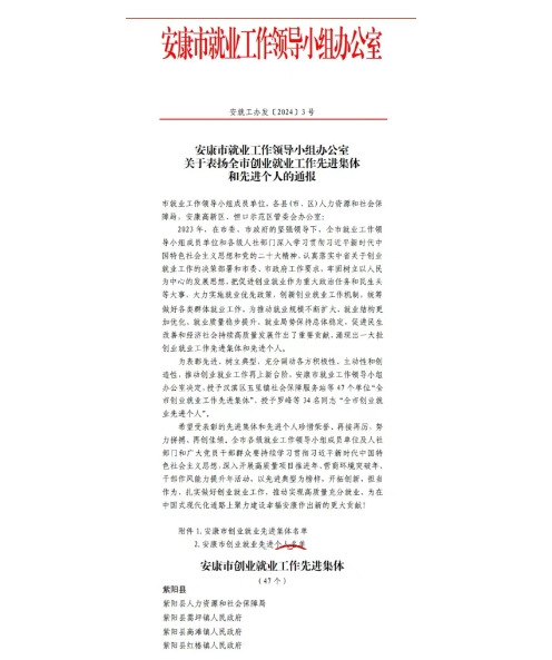新西部網(wǎng)消息(龔洺高婷)2月4日,安康市人社局對全市創(chuàng)業(yè)就業(yè)工作先進(jìn)集體和先進(jìn)個人進(jìn)行了通報表揚(yáng),紫陽縣人社局榮獲“全市就業(yè)創(chuàng)業(yè)先進(jìn)工作集體”稱號。
