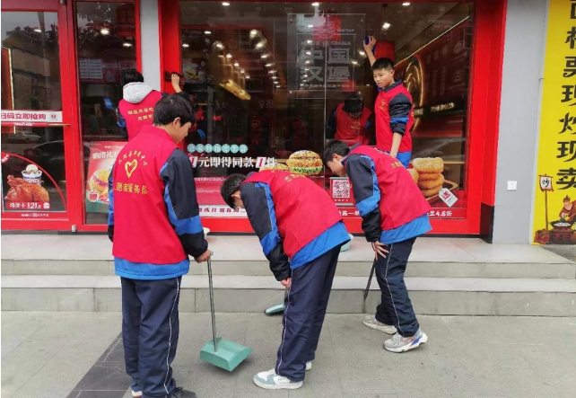 在輔導(dǎo)員老師的帶領(lǐng)下,同學(xué)們列隊有序到達(dá)指定地點,待店長進(jìn)行簡單培訓(xùn)基本操作流程之后,志愿者們立馬全身心投入到學(xué)雷鋒的義務(wù)勞動中。有的協(xié)助餐廳服務(wù)員整理貨箱,有的擦拭門店內(nèi)外玻璃,有的打掃餐廳大堂的地面,有的清潔餐桌衛(wèi)生、規(guī)范桌椅擺放,有的到店門外的綠地?fù)焓皝G棄的煙頭、紙屑等垃圾。大家都迅速進(jìn)入“崗位”各司其職,為到店用餐的消費者營造了干凈整潔、溫馨舒適的用餐環(huán)境,提高了餐廳的服務(wù)質(zhì)量。