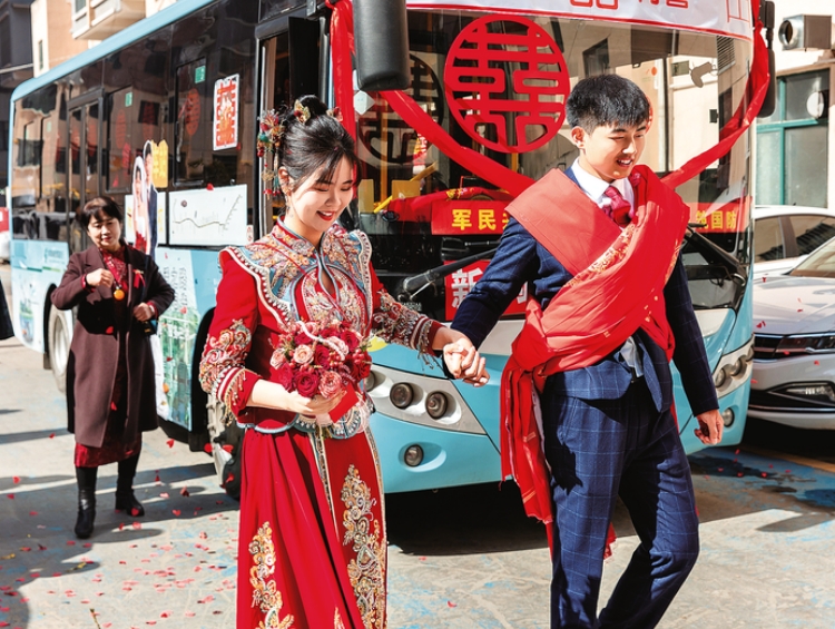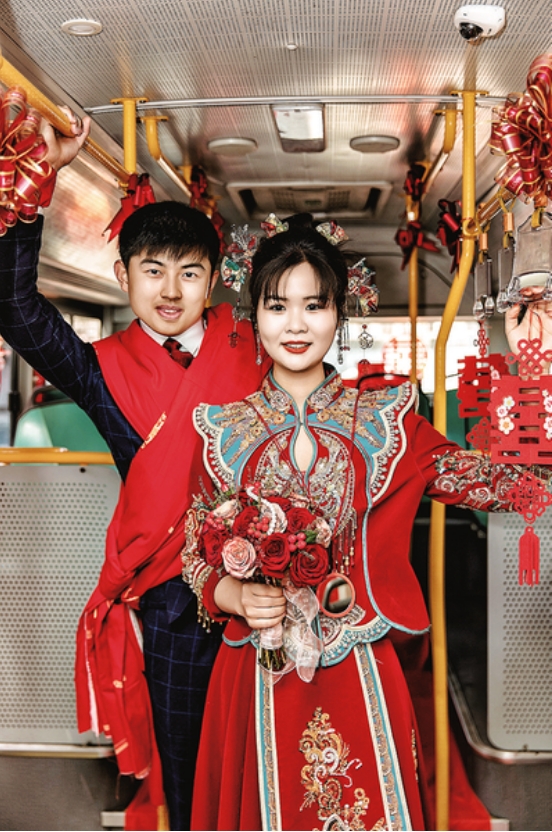 新郎張園濤是洛南縣城關(guān)派出所一名內(nèi)勤民警,他表示,在長期的基層工作中,對移風(fēng)易俗、低碳環(huán)保的生活方式有更深一層的認(rèn)識,新娘提出用公交車做婚車的想法后他第一個(gè)支持。新娘田添是一名在讀研究生,開朗外向的她對于婚禮怎么辦,很有自己的想法。她說:“我認(rèn)為的婚禮應(yīng)該是和最愛的家人、朋友一起才有氛圍?;槎Y更要注重的是內(nèi)心的感受而不是隆重鋪張的形式,與豪華車隊(duì)相比,公交車更有性價(jià)比,大空間能把大家都聚集在一起,氛圍感更好。我們的伴娘和伴郎都是千里之外趕來的好朋友,他們很用心來參加我們的婚禮,我也想讓他們在感受幸福的同時(shí)有不一樣的體驗(yàn)。”