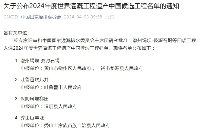 近日,經(jīng)專(zhuān)家評(píng)審和中國(guó)國(guó)家灌溉排水委員會(huì)主席團(tuán)研究批準(zhǔn),陜西省安康市漢陰鳳堰梯田等四項(xiàng)工程入選2024年度世界灌溉工程遺產(chǎn)中國(guó)候選名單。待后將立即辦理申報(bào)書(shū)、視頻英文翻譯并相關(guān)資料上報(bào)國(guó)際灌排委,經(jīng)國(guó)際組織大會(huì)審查。