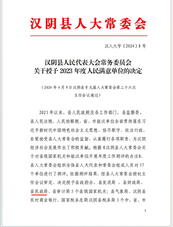 新西部網(wǎng)消息(通訊員俞亞靜)近日,漢陰縣人大常委會授予8個單位“漢陰縣 2023 年度人民滿意單位”稱號,漢陰縣民政局連續(xù)八年獲得此殊榮。