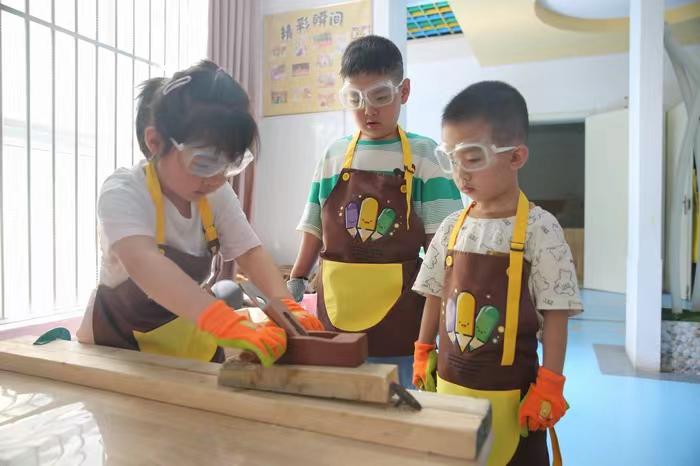 石泉縣幼兒園的木工坊充滿童趣,提供了操作臺(tái)、工作服、傳統(tǒng)與現(xiàn)代工具及各式各樣的操作材料供孩子們自主選擇。中班和大班幼兒每周都進(jìn)入木工坊體驗(yàn)做“小小木匠”的快樂,每次時(shí)長(zhǎng)60分鐘,每逢木工特色課程活動(dòng)時(shí)間,木工坊里的機(jī)器切割聲、木頭敲打聲猶如美妙的“交響曲”。孩子們戴著防護(hù)手套、護(hù)目鏡等防護(hù)裝備化身“小魯班”,在老師的指導(dǎo)下學(xué)習(xí)操作常用的木工工具,體驗(yàn)刨、鉆、挫、鋸、粘、貼等操作過程,在歡樂輕松的游戲氛圍中主動(dòng)學(xué)習(xí),體驗(yàn)動(dòng)手、動(dòng)腦和自由制作的樂趣。
