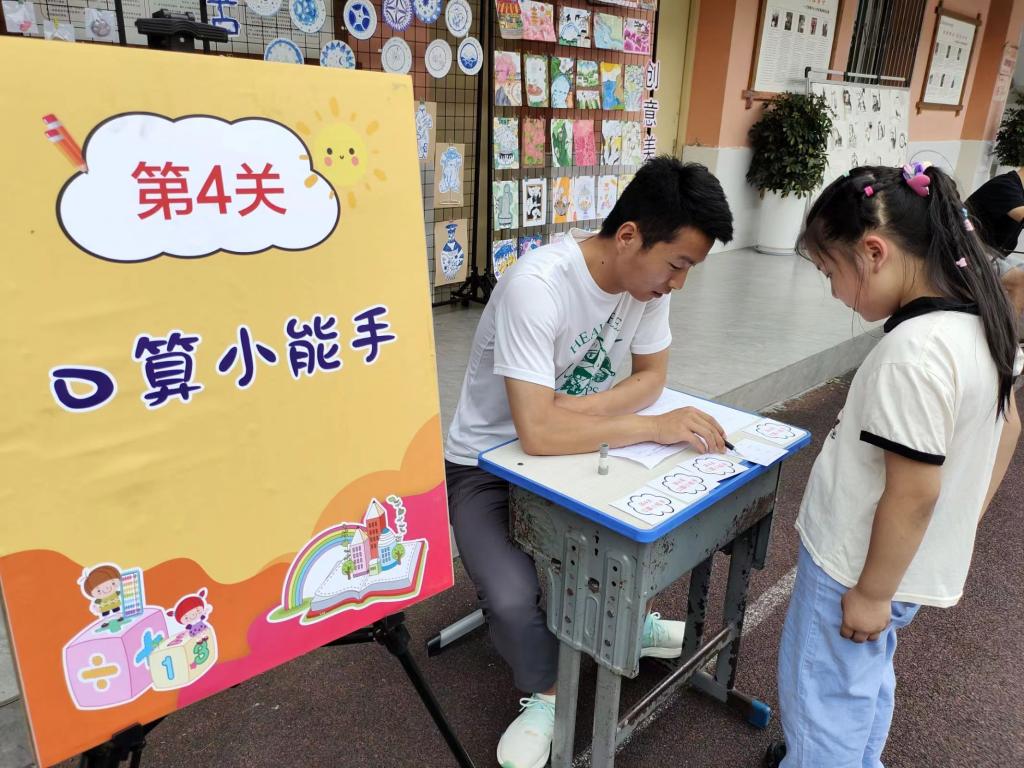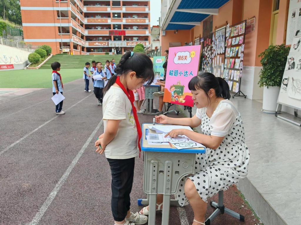 活動現場,孩子們分成小組,拿著自己的記錄表依次闖關。在各闖關環(huán)節(jié)過程中面對測評既興奮又緊張,有的自然大方,對答如流;有的雙眉緊鎖,思考深入;有的動手操作,毫不遜色……對于他們來說,每一個關卡都充滿了吸引力,各種新穎、好玩的游戲考題讓孩子們“考”得非常盡興?;顒咏Y束后,學生熱烈交流著自己闖關的體會,展示自己的闖關成果,臉上洋溢著童真和笑容。