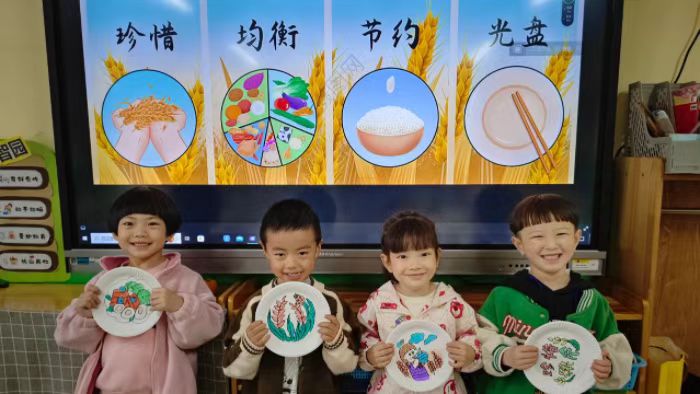 根據(jù)不同幼兒的年齡和認知特點,各班組還有不同的活動。小班幼兒吟誦《憫農(nóng)》《觀田家》《農(nóng)家》等古詩,深刻體會農(nóng)民伯伯辛勤耕作的不易;中班幼兒則通過繪畫表達對糧食的認識與理解,他們在老師的指導(dǎo)下用稚嫩的筆觸畫出了一片片豐收的景象以及餐桌上的美味佳肴,表達了對食物的感恩之心;大班孩子學(xué)習(xí)表演《聽我說》手勢舞,結(jié)合歌曲與動作,讓孩子們在輕松愉快的氛圍中學(xué)習(xí)和領(lǐng)悟節(jié)約糧食的重要性。