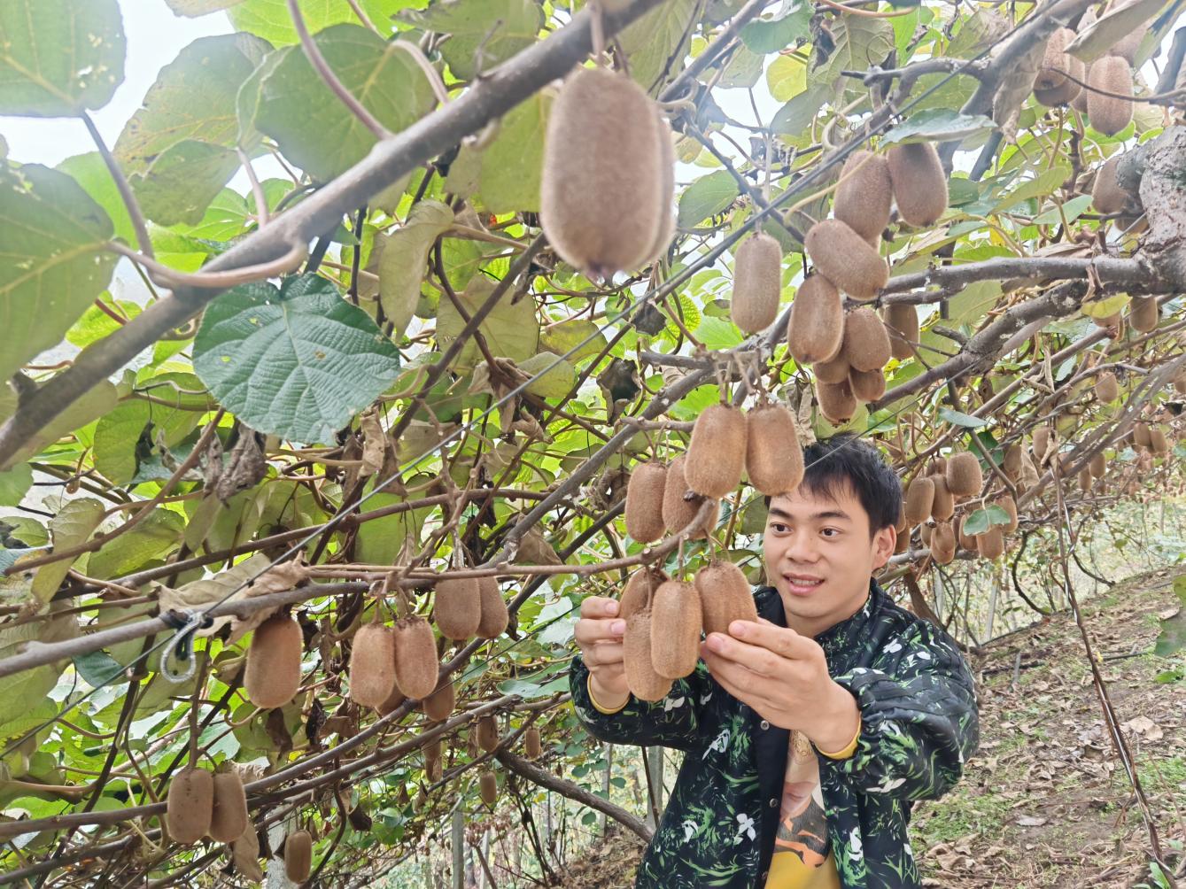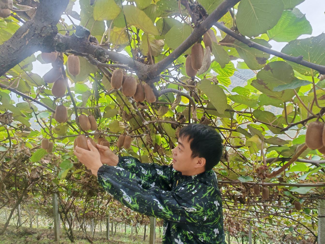 圖為老鴉村一新獼猴桃園區(qū)負(fù)責(zé)人趙一新正在果園查看獼猴桃 劉勇/攝