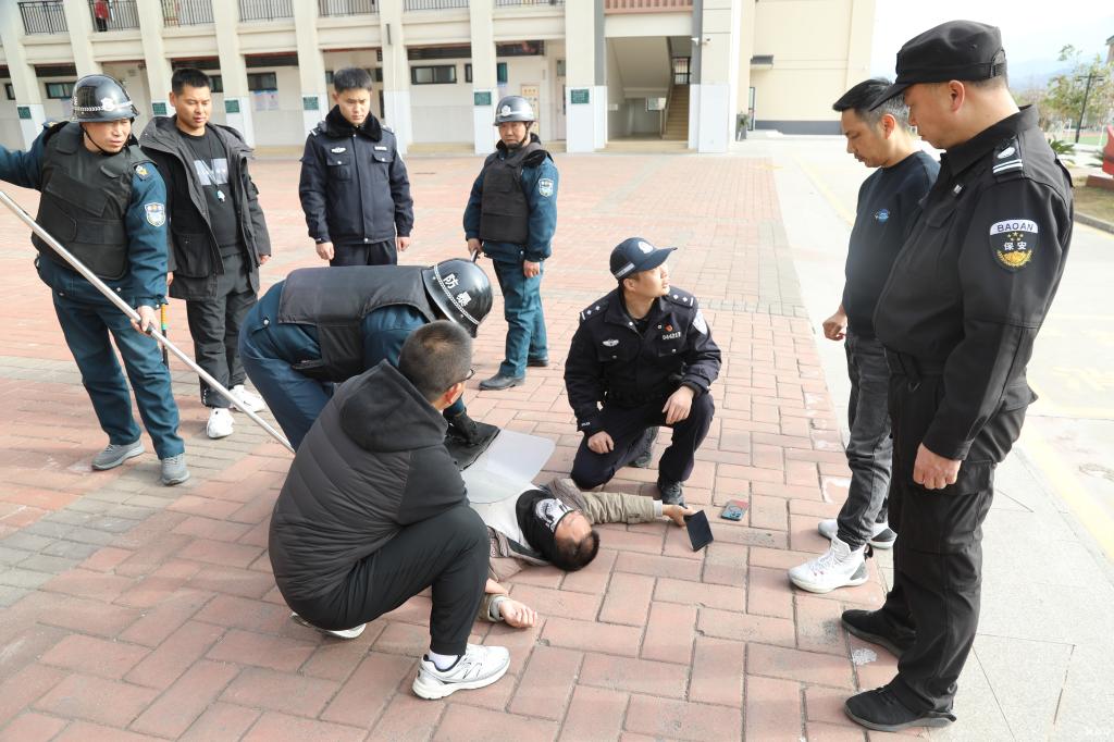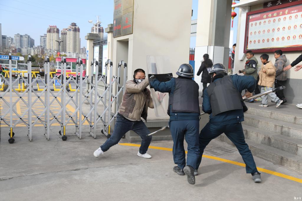 演練時,按照預(yù)設(shè)場景,模擬了一名“暴徒”闖入校園“襲擊”師生的場景。當(dāng)“暴徒”破門而入沖進(jìn)校園時,一名保安立即按下“一鍵報警裝置”,報告當(dāng)天值班領(lǐng)導(dǎo),并立即啟動應(yīng)急預(yù)案。同時,校園內(nèi)操場上授課或玩耍的學(xué)生被老師組織有序返回教室,緊閉門窗。護(hù)校隊成員迅速行動,協(xié)同民警、保安等人員利用鋼叉、警棍等器械與“暴徒”“搏斗”,并將其制服帶離現(xiàn)場。
