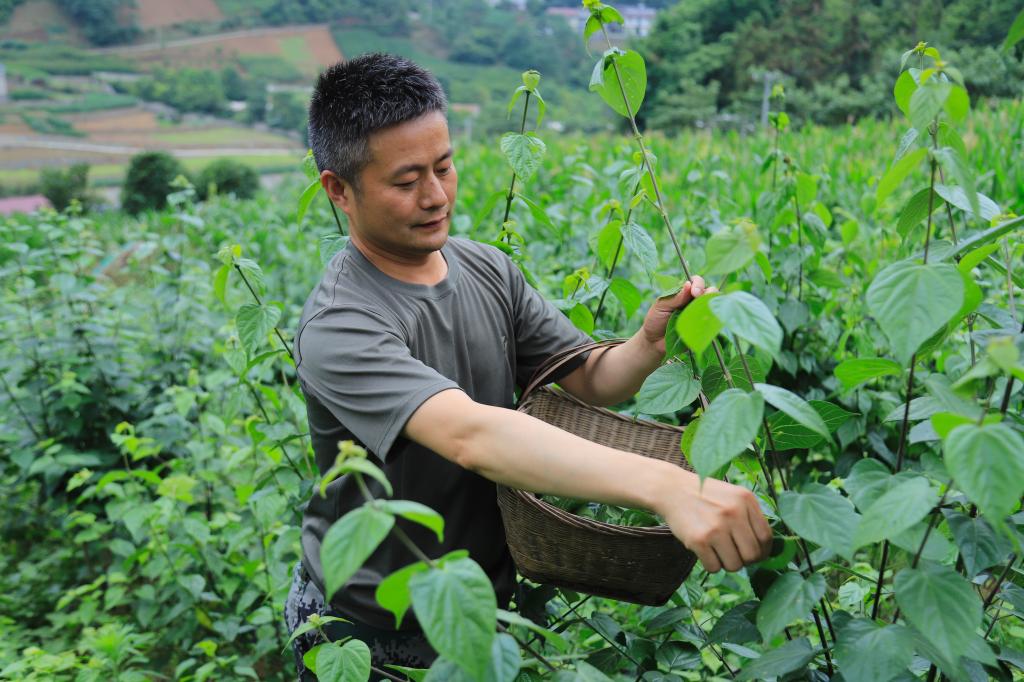 包登國(guó)采摘神仙樹(shù)葉(廖霖/攝)