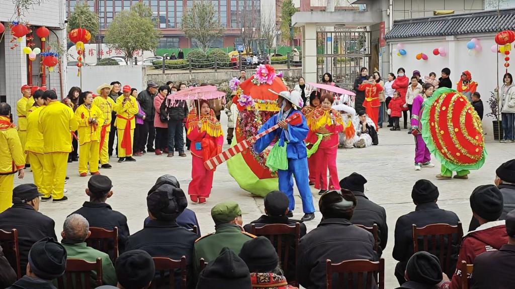 隨后,職工和老人代表身著彩衣,劃著彩龍船、唱著花鼓喜慶上場(chǎng)。老人們和黨員們跟著節(jié)奏或起舞、或吟唱、或打拍子,氣氛好不熱鬧,瞬間將節(jié)日氛圍推向了高潮。