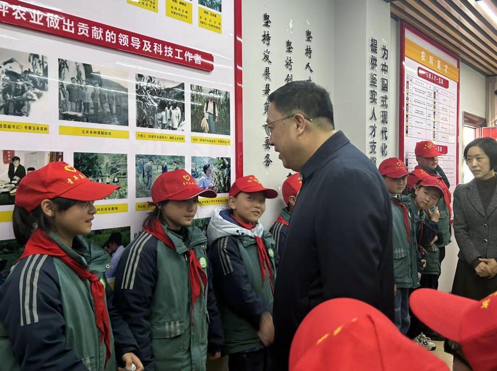 調(diào)研期間,曙坪鎮(zhèn)小學(xué)的學(xué)生正在農(nóng)科所開展實踐活動。李忠民停下腳步,與師生們親切交談,他詳細詢問孩子們的生活情況與研學(xué)體驗?!澳銈兌嗌贇q?長多高了?”“對農(nóng)業(yè)科學(xué)感興趣嗎?”李忠民俯身傾聽學(xué)生們的回答,鼓勵孩子們從小樹立科學(xué)精神,勤于動手實踐,爭做新時代科技創(chuàng)新的“小先鋒”。同時,他還叮囑農(nóng)科所科研人員,要結(jié)合青少年特點,設(shè)計更多互動性、趣味性強的科普課程,讓科學(xué)的種子在孩子們心中生根發(fā)芽。李忠民強調(diào),要充分發(fā)揮農(nóng)科所在農(nóng)業(yè)科學(xué)普及中的重要作用,助力鄉(xiāng)村振興和青少年科學(xué)素養(yǎng)提升。
