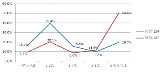 在3019名父母都外出的學(xué)生(稱為完全留守兒童)中,有2729名學(xué)生(占90.4%)填寫了與母親見面次數(shù)的情況。農(nóng)村完全留守兒童與母親一年見面9次以上的比例(19.7%)明顯低于城鎮(zhèn)完全留守兒童(50.4%)。有近40%的農(nóng)村完全留守兒童與母親一年見面1-2次,有15.6%的農(nóng)村完全留守兒童與母親一年都沒有見面。