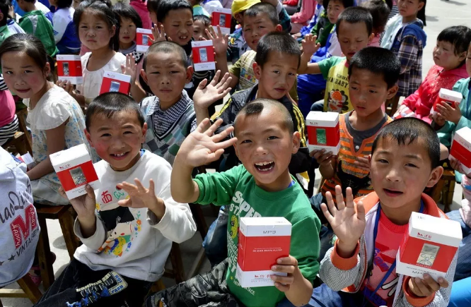 ▲孩子們拿到“上學(xué)路上”精心準(zhǔn)備的MP3故事盒子,不再羞澀,對著鏡頭開心地笑著