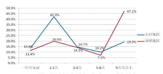 ▲圖3:農(nóng)村和城鎮(zhèn)完全留守兒童與母親一年見面次數(shù)的分布情況