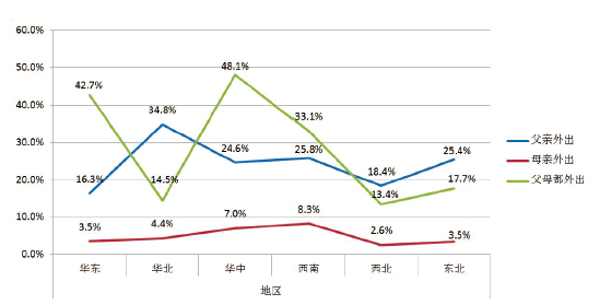 (3)在提供信息的學(xué)生中,缺父留守兒童所占的比例是26.9%,華東和西北地區(qū)的比例遠(yuǎn)低于這一平均水平,分別為16.3%和18.4%;華中、西南和東北地區(qū)略低于平均水平,分別24.6%、25.8%和25.4%;華北地區(qū)遠(yuǎn)高于平均水平,為34.8%。