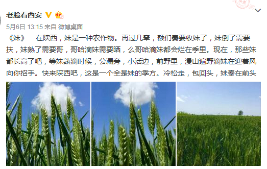 編者按:在陜西妹是一種農(nóng)作物。再過幾牽,額們奏要收妹了,妹倒了需要扶,妹熟了需要哥,哥哈滴妹需要曬,么哥哈滴妹都會爛在季里。現(xiàn)在,那些妹都長高了吧,等妹熟滴時候,公漏旁,小活邊,前野里,漫山遍野滴妹在迎著風(fēng)向你招手。