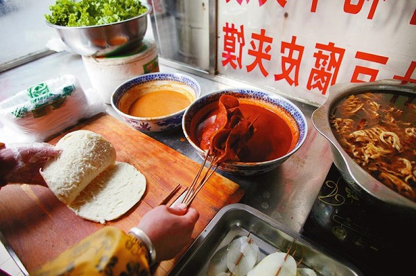 把饃(燒餅)掰開夾食材的吃法,叫夾饃。夾肉的叫肉夾饃,夾菜的叫菜夾饃。這種吃法將兩種食材絕妙地組合在一起,碰撞出讓人欲罷不能的滋味。由于其味香、簡單、頂飽,正符合彪悍、粗獷的秦人性格,夾饃在陜西可謂枝繁葉茂,品類繁多。在搟面皮夾饃火之前,有“高陵漢堡”之稱的土豆片夾饃也火遍了年輕人的朋友圈,當(dāng)然各種夾饃中,名氣最大的還要屬肉夾饃,不僅陜西人喜愛,在全球各地,排隊(duì)買肉夾饃的新聞常見諸于報(bào)端。