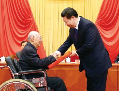 2015年全國科技獎頒獎大會上,89歲的核物理學家于敏坐在輪椅上,從習近平主席手中接過國家最高科技獎的大紅證書。