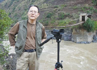 2013年5月,余戈協(xié)助央視拍攝紀(jì)錄片《騰沖騰沖》時(shí)在滇西考察。背景為怒江雙虹橋。