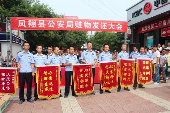 新西部網(wǎng)訊(曹旭 閆超 通訊員辛欣)8月13日上午10時(shí),鳳翔縣公安局在縣政府門前舉行了贓物發(fā)還大會(huì)。展示了“秦風(fēng)行動(dòng)”嚴(yán)打整治戰(zhàn)果,對(duì)涉案財(cái)物進(jìn)行現(xiàn)場返還,百余名群眾參加。此次大會(huì)共發(fā)還被盜摩托車、電動(dòng)車45輛,被盜香煙等108件,累計(jì)涉案價(jià)值20余萬元,收到群眾贈(zèng)送錦旗十余面。