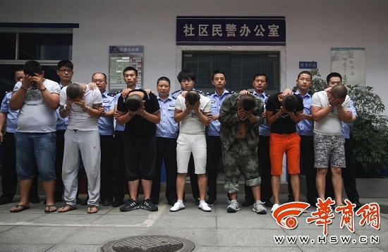 2015年8月9日,西安市北關(guān)派出所,7名涉案人員被民警抓住并審訊,對(duì)自己的行為很懊悔。