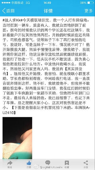 回想起今天中午的一幕,王珂到現在還心有余悸。今天中午,王珂參加完培訓便在高新一中高中部本部攔下了車牌為陜AU2410的出租車準備回家?!爱敃r出租車的后座有人,我便坐在了副駕駛的位置上,由于車上有人,司機就沒有給我打表,還告訴我等后面人下了再給我打表,但等后面的女孩下車后,司機突然伸手摸上我的大腿?!蓖蹒嬲f,自己當時心里非常害怕,請求司機不要這樣,但司機變本加厲又開始撩自己的裙子。