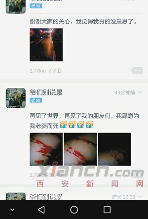 7月15日晚11時許,市民王先生在翻看陌陌附近留言時,無意中發(fā)現(xiàn)一條讓他很震驚的留言:“再見了世界,再見了我的朋友們,我愿意為我老婆而死?!痹摋l留言還配發(fā)了三張圖片,畫面顯示手腕處至少劃開了兩道口子,而且鮮血直流。