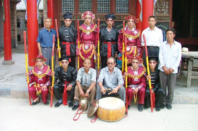 在過去,“八打棍”表演的服裝并無統(tǒng)一樣式,各穿各的,頂多在頭上扎個頭巾,顯得精神點(diǎn)兒。后來參加縣上和市上的表演時,給表演者穿上了統(tǒng)一的服裝,樣子就是你在照片上看到的那樣,像古裝戲的服裝。