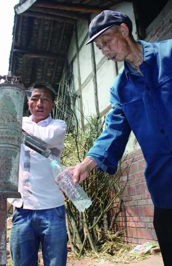 ▲楊云清取家鄉(xiāng)的井水,由云南侄兒帶回去交給老父親。