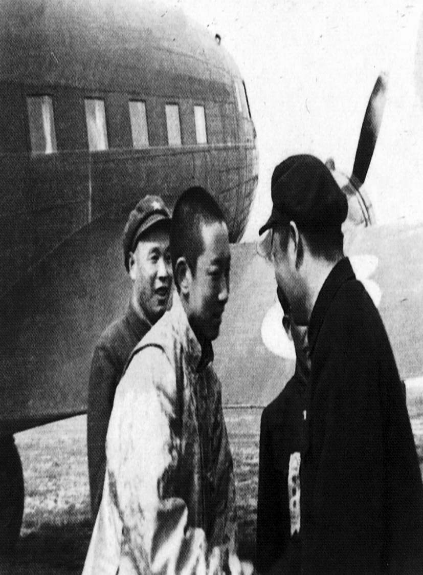 ▲1951年4月22日,習(xí)仲勛(右一)在西安機(jī)場迎接十世班禪,左一為駐班禪行轅代表范明。