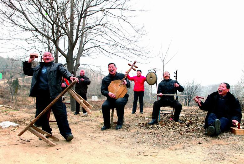 由11人組成的華陰老腔藝術(shù)團(tuán),有5個(gè)人是雙泉村的,而且都姓張,是沒出五服的堂兄弟,其中張喜民、張轉(zhuǎn)民、張拾民是親兄弟。