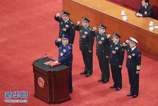 3月18日,十三屆全國人大一次會議在北京人民大會堂舉行第六次全體會議。大會經(jīng)投票表決,決定許其亮、張又俠為中央軍委副主席,決定魏鳳和、李作成、苗華、張升民為中央軍委委員。這是中央軍委副主席、委員進(jìn)行憲法宣誓。新華社記者 龐興雷 攝