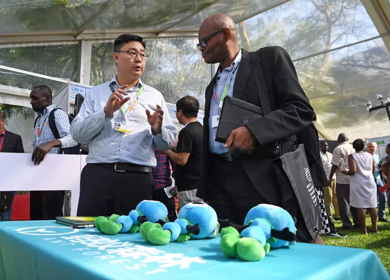 12月3日,在肯尼亞首都內(nèi)羅畢,螞蟻森林總經(jīng)理徐笛(左)向參會者介紹企業(yè)環(huán)保理念。新華社記者陳誠攝