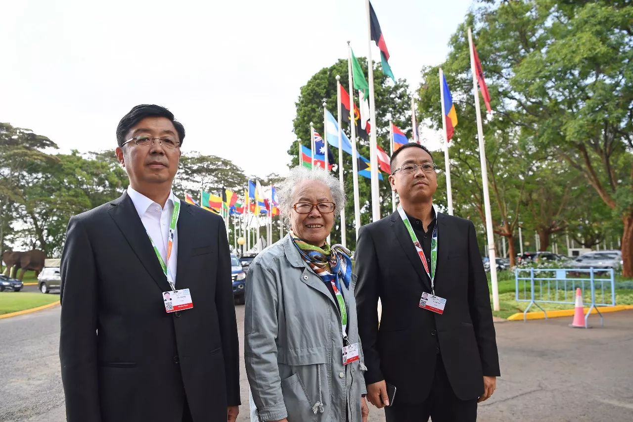 12月5日在肯尼亞內(nèi)羅畢聯(lián)合國環(huán)境規(guī)劃署總部拍攝的塞罕壩林場老中青三代陳彥嫻(中)、劉?,摚ㄗ螅?、于士濤的合影。 新華社記者陳誠攝