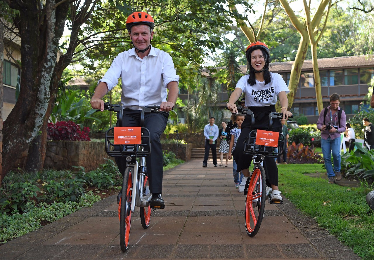 12月3日,在肯尼亞首都內(nèi)羅畢,摩拜單車創(chuàng)始人胡瑋煒(右)與聯(lián)合國環(huán)境規(guī)劃署執(zhí)行主任埃里克·索爾海姆騎車同行。新華社記者陳誠攝
