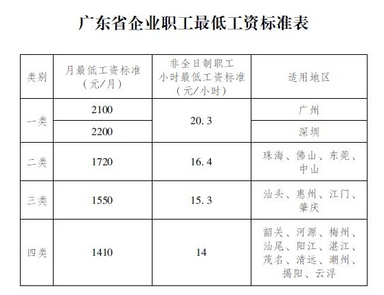 廣東省企業(yè)職工最低工資標準表 廣州省政府網(wǎng)站截圖