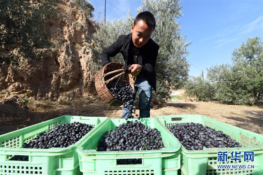在甘肅省隴南市武都區(qū)漢王鎮(zhèn),一名男子將采摘的油橄欖倒入收納箱(2018年10月30日攝)。新華社記者 范培珅 攝