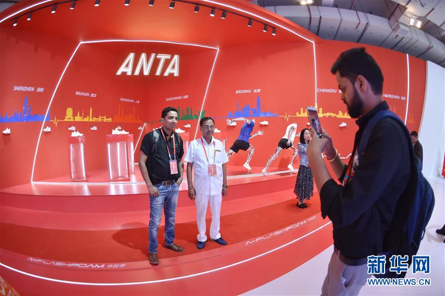在一年一度的中國(guó)(晉江)國(guó)際鞋業(yè)暨國(guó)際體育產(chǎn)業(yè)博覽會(huì)上,來(lái)自印度的客商在安踏展位前留影(2018年4月19日攝)。新華社記者 宋為偉 攝
