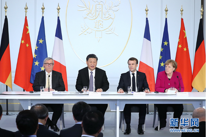 3月26日,國家主席習(xí)近平在巴黎同法國總統(tǒng)馬克龍一道出席中法全球治理論壇閉幕式。德國總理默克爾、歐盟委員會主席容克應(yīng)邀出席。新華社記者 鞠鵬 攝