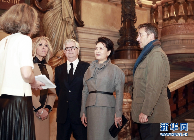 當(dāng)?shù)貢r間3月25日,國家主席習(xí)近平夫人彭麗媛在法國總統(tǒng)夫人布麗吉特陪同下參觀位于巴黎市第九區(qū)的法國巴黎歌劇院。新華社記者 丁林 攝