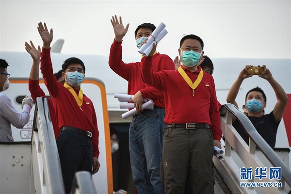 4月11日,在委內(nèi)瑞拉首都加拉加斯,中國抗疫醫(yī)療專家組在授勛儀式結(jié)束后登機(jī)回國。新華社發(fā)(薩爾戈多攝)