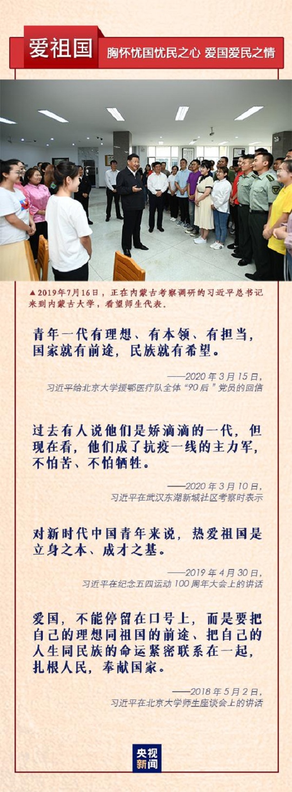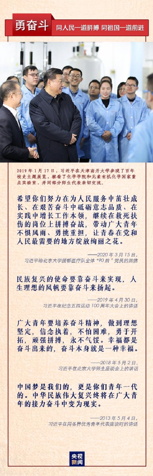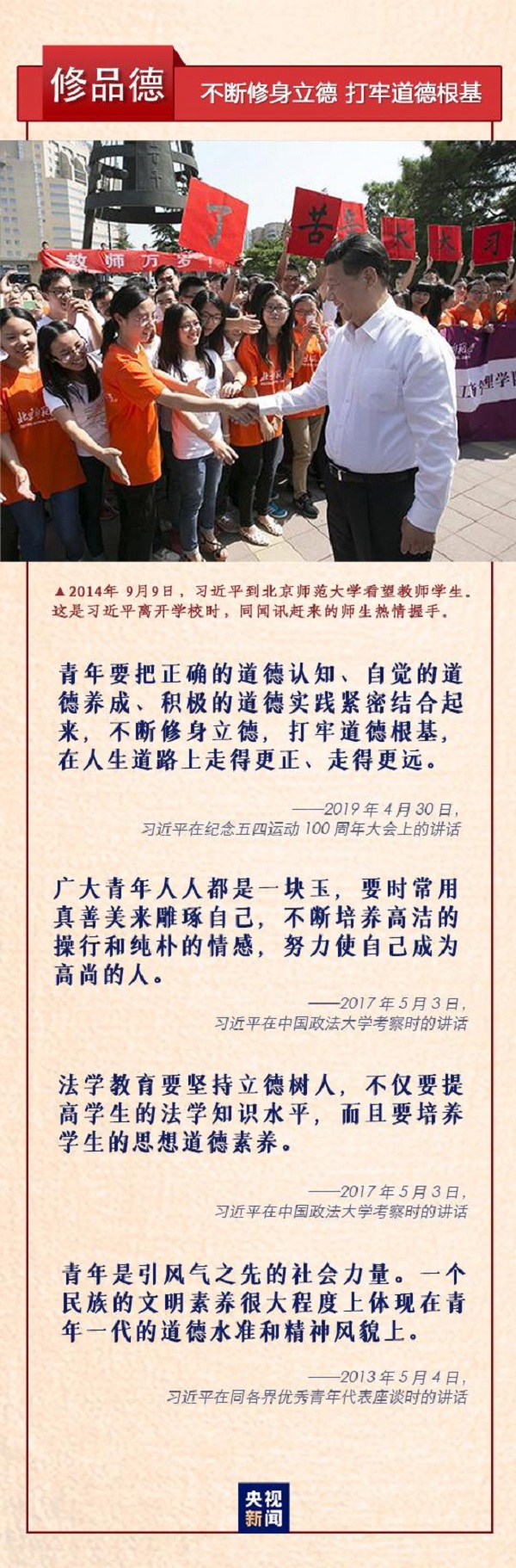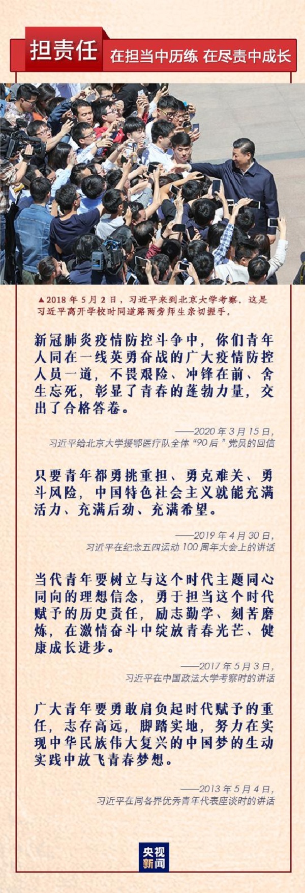 “樹立遠(yuǎn)大理想”“熱愛偉大祖國(guó)”“擔(dān)當(dāng)時(shí)代責(zé)任”“勇于砥礪奮斗”“練就過(guò)硬本領(lǐng)”“錘煉品德修為”,習(xí)近平總書記在紀(jì)念五四運(yùn)動(dòng)100周年大會(huì)上對(duì)新時(shí)代中國(guó)青年提出六點(diǎn)希望,激勵(lì)廣大青年不懼風(fēng)雨、不畏險(xiǎn)阻,在實(shí)現(xiàn)中華民族偉大復(fù)興中國(guó)夢(mèng)的進(jìn)程中不斷開拓創(chuàng)新、奮發(fā)有為。