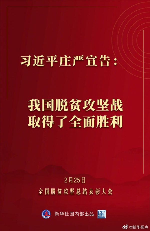 習(xí)近平在#全國脫貧攻堅(jiān)總結(jié)表彰大會(huì)#上發(fā)表重要講話,莊嚴(yán)宣告,經(jīng)過全黨全國各族人民共同努力,在迎來中國共產(chǎn)黨成立一百周年的重要時(shí)刻,我國脫貧攻堅(jiān)戰(zhàn)取得了全面勝利,現(xiàn)行標(biāo)準(zhǔn)下9899萬農(nóng)村貧困人口全部脫貧,832個(gè)貧困縣全部摘帽,12.8萬個(gè)貧困村全部出列,區(qū)域性整體貧困得到解決,完成了消除絕對(duì)貧困的艱巨任務(wù),創(chuàng)造了又一個(gè)彪炳史冊(cè)的人間奇跡!這是中國人民的偉大光榮,是中國共產(chǎn)黨的偉大光榮,是中華民族的偉大光榮!