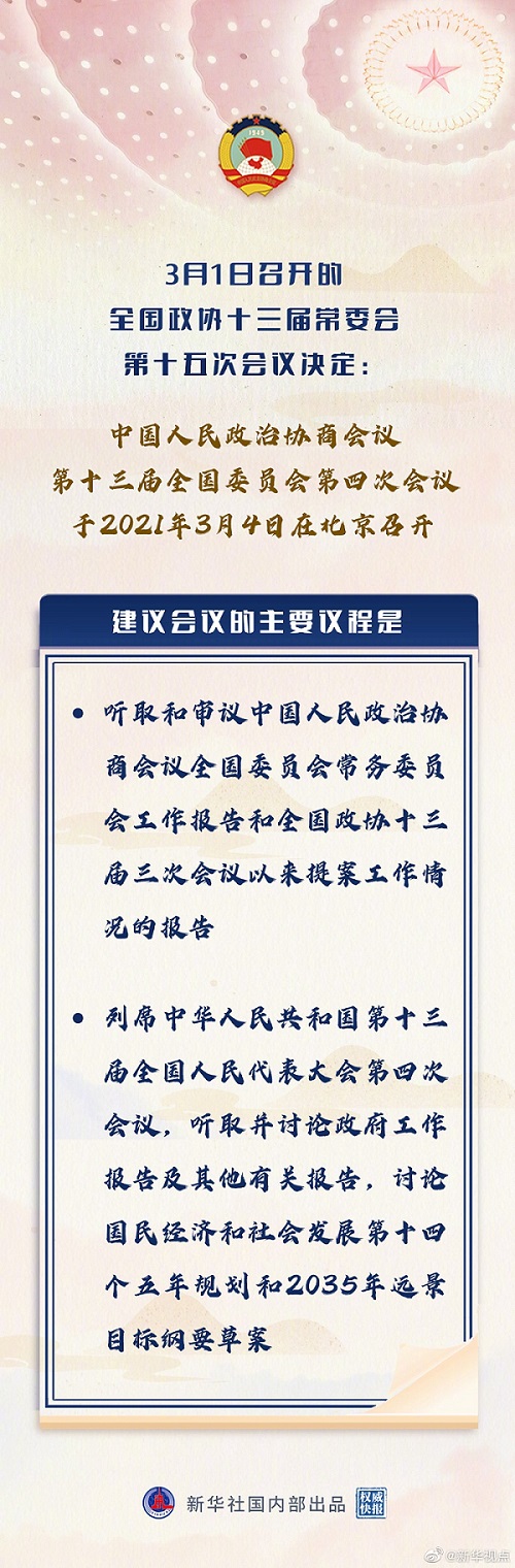 中國人民政治協(xié)商會(huì)議第十三屆全國委員會(huì)常務(wù)委員會(huì)第十五次會(huì)議決定:中國人民政治協(xié)商會(huì)議第十三屆全國委員會(huì)第四次會(huì)議于2021年3月4日在北京召開。建議會(huì)議的主要議程是:聽取和審議中國人民政治協(xié)商會(huì)議全國委員會(huì)常務(wù)委員會(huì)工作報(bào)告和全國政協(xié)十三屆三次會(huì)議以來提案工作情況的報(bào)告;列席中華人民共和國第十三屆全國人民代表大會(huì)第四次會(huì)議,聽取并討論政府工作報(bào)告及其他有關(guān)報(bào)告,討論國民經(jīng)濟(jì)和社會(huì)發(fā)展第十四個(gè)五年規(guī)劃和2035年遠(yuǎn)景目標(biāo)綱要草案。